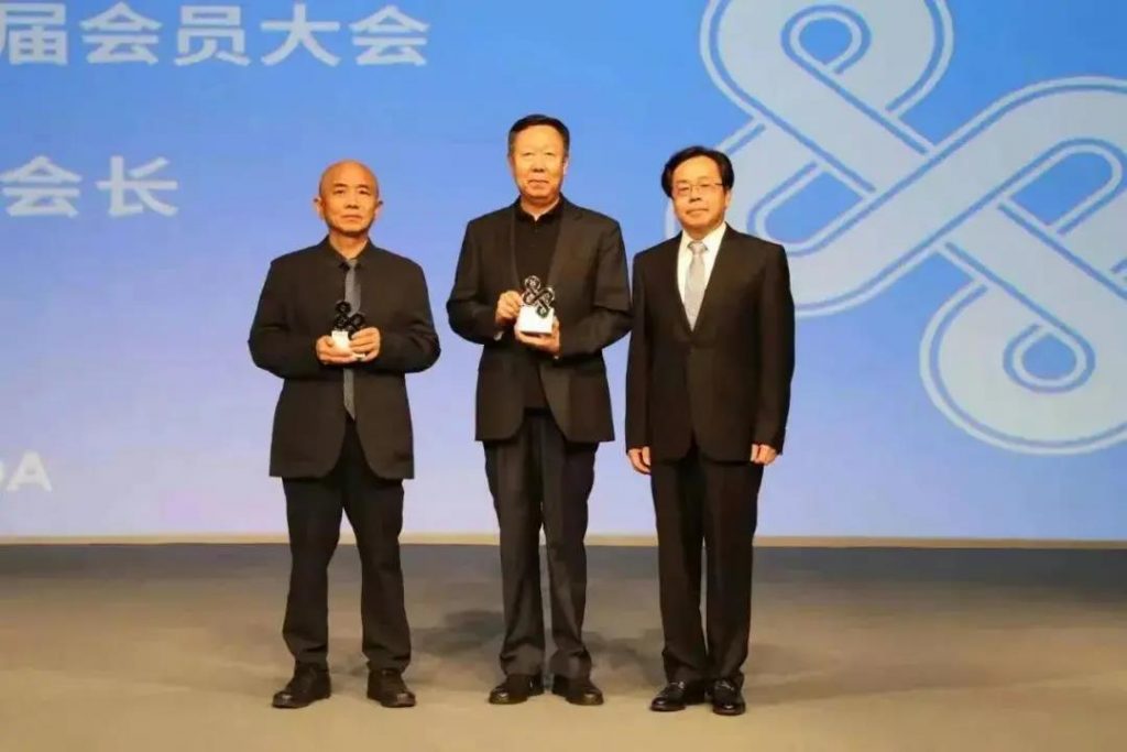 李小甘会长为两位名誉会长任克雷、孟建民授牌。